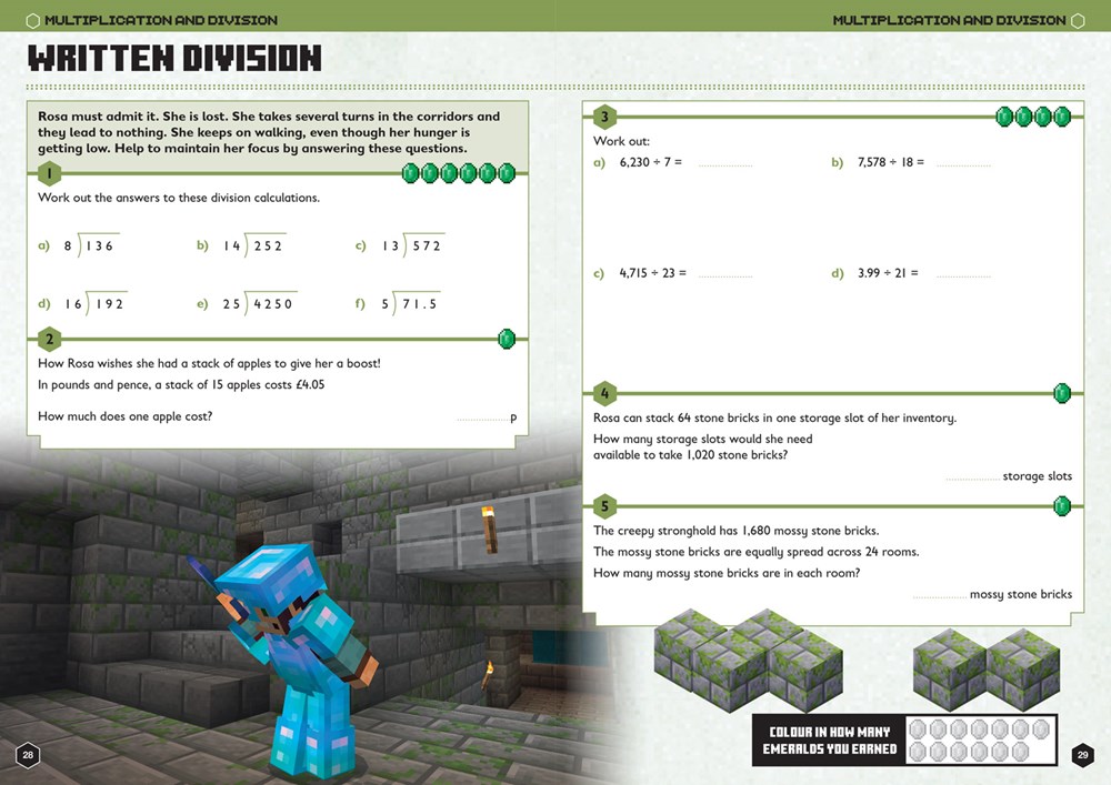 The only official Minecraft maths book for children aged 10-11! Children embark on a Minecraft adventure in each maths topic, using their maths skills and knowledge to complete the tasks and earn rewards. This is a write-in maths practice workbook which uses the Minecraft game as a mechanism for practising the key maths skills covered in Year 6. Accomplish maths activities to help Minecraft characters on their missionsExplore different biomes in each topicEarn emeralds as you work through the book, and choose how you spend themGo hardcore with challenging questions
