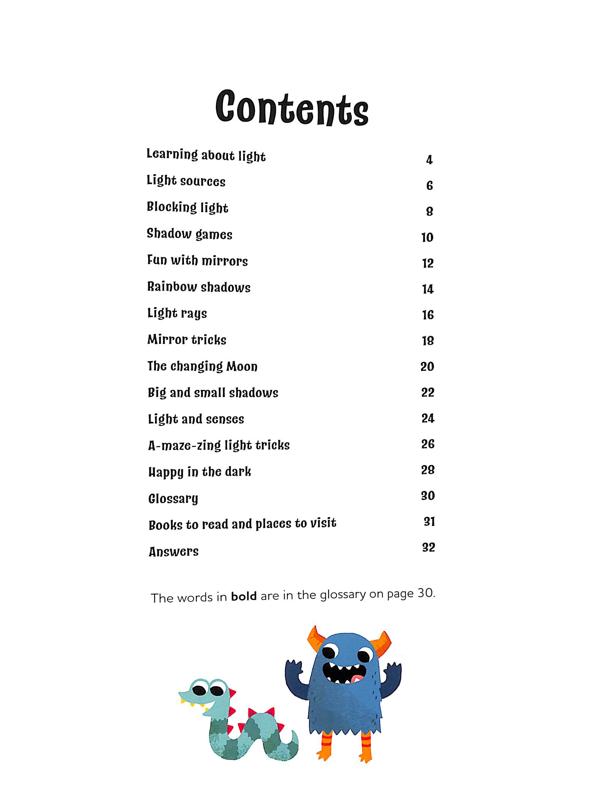 Contents: Learning about light, Light sources, Blocking light, Shadow games, Fun with mirrors, Rainbow shadows, Light rays, Mirror tricks, The changing moon, Big and small shadows, Light and senses, A-maze-ing light tricks, Happy in the dark, Glossary, Books to read and places to visit, Answers