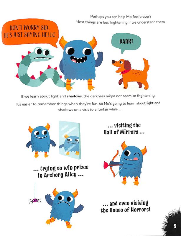 Learn all about light with Mo the Monster and his friends in this fun first science book for children aged 5+. Mo is a little bit afraid of the dark, but today he is going the funfair and learning all about light and shadows. He and his friend Sid find out about sources of light, how light travels and reflects, while having fun in the hall of mirrors and watching a puppet show and much more.