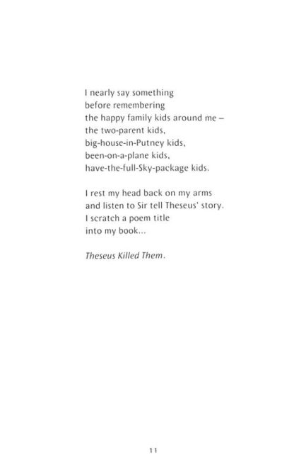 Three storylines run simultaneously in this extraordinary novel. Theo is studying for his A-levels and trying to find his father. Theseus is the central character in an essay Theo is working upon and the Minotaur also wants to know his father. The story is labyrinthine with false paths and doubling backs. It concludes in a way that is at once beautiful and emotionally satisfying. A rites of passage novel told through poems about becoming a man and discovering what manhood is and can be.